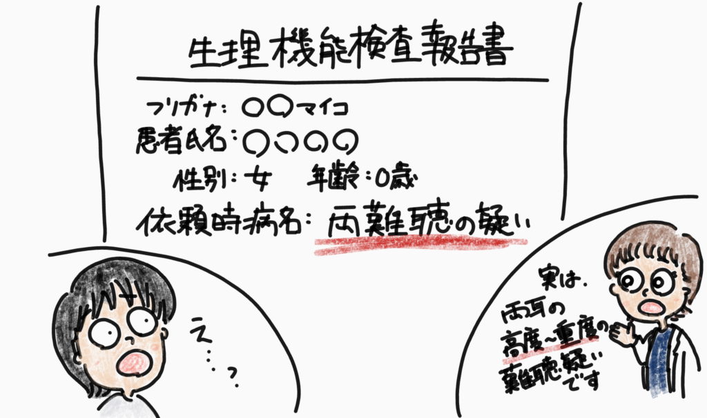検査結果の紙を渡され、「まいこちゃん、やっぱり聞こえていないみたいで…。」