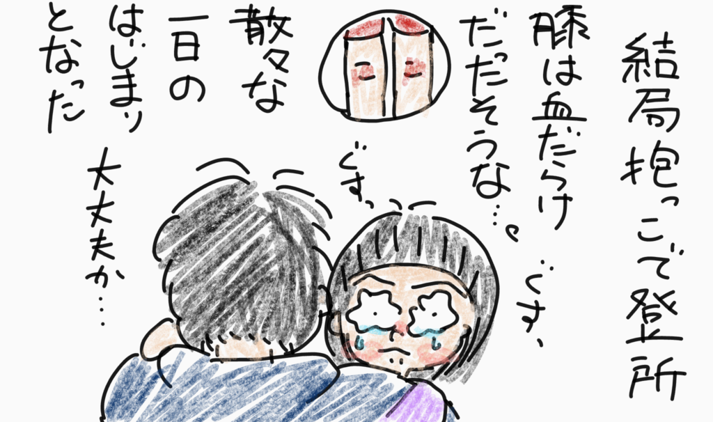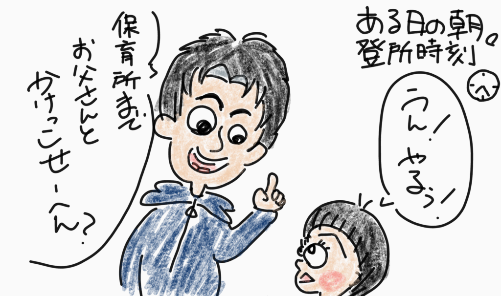 ある日の朝 育児日記 Twitter Facebook はてブ Pocket LINE コピー 2025.12.17 2025.12.16 とある朝、めいこにかけっこを申し込んだお父さん。 こんな一日のはじまり。 でも保育所では元気に過ごせました。 お迎えにいったらしっかり処置施されてました。