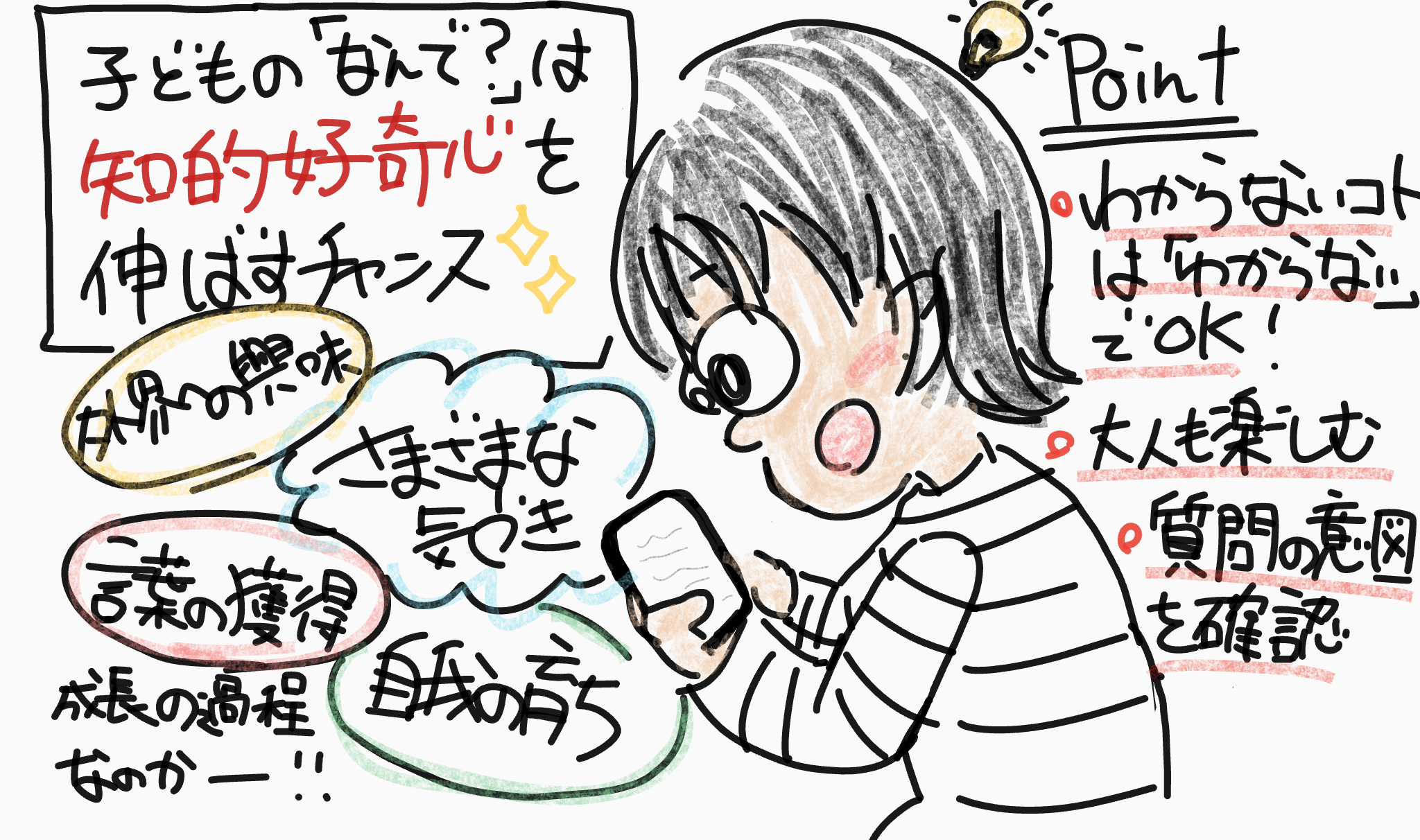 この”なんでなんで”がどういうものか、どのようにして吸収されるかなどを理解していると少しは答え方は変わっていたのかもと思うと、日々勉強で、無知は場合によってはよくないなあって感じました。