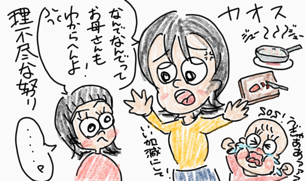 問題は、まいこが泣く+晩御飯の準備=カオスな状態の時になんでなんで子ちゃんが来ると私はイラっとしてしまうことがよくあった。